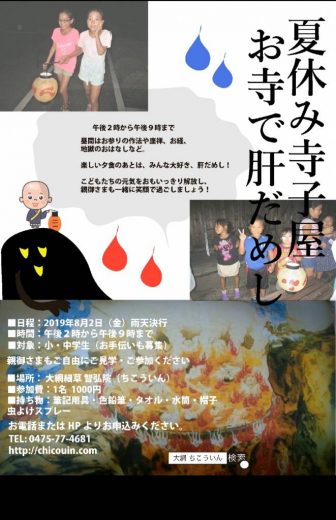 昼間はお参りのお作法や座禅、お経、地獄のおはなしなど。楽しい夕食の後は、みんな大好き肝だめし! …