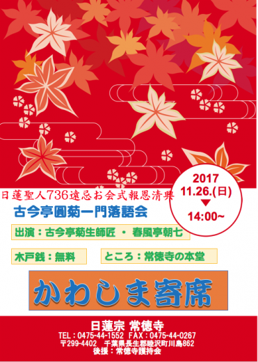御会式法要とかわしま寄席 イベント・活動 記事公開日:2017年11月23日 この記事は最終更新日から1年以上経過しています。記事の内容やリンク先については現在と状況が異なる場合がありますのでご注意ください。 開催日:2017年11月26日 日蓮聖人763遠忌御会式法要とかわしま寄席(落語会)を11月26日(日)に行います。 落語会は、本堂にて午後2時からを予定しています。入場無料ですので興味のある方は、どうぞお立ち寄り下さい。 この記事は最終更新日から1年以上経過しています。記事の内容やリンク先については現在と状況が異なる場合がありますのでご注意ください。 PREV NEXT 一覧へ