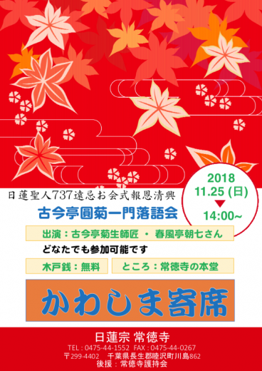 お会式法要とかわしま寄席(落語会) イベント・活動 記事公開日:2018年11月14日 この記事は最終更新日から1年以上経過しています。記事の内容やリンク先については現在と状況が異なる場合がありますのでご注意ください。 開催日:2018年11月25日 11月25日(日)13時から日蓮大聖人737遠忌お会式法要(日蓮大聖人へのご遺徳を偲んでのご法事)を常徳寺本堂にて営みます。 また、14時からは「かわしま寄席」古今亭圓菊一門落語会を開催致します。 お檀家さんでなくても、どなたでも伝統芸能に触れられるチャンスです。 しかも、木戸銭無料で開放致しますので、どうぞお見えください。 お見えになる方は、お寺の本堂へ直接お越し下さい。 この記事は最終更新日から1年以上経過しています。記事の内容やリンク先については現在と状況が異なる場合がありますのでご注意ください。 PREV NEXT 一覧へ