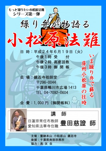 もっと知りたい小松原法難 シリーズ第1弾 イベント・活動 記事公開日:2012年05月13日 この記事は最終更新日から1年以上経過しています。記事の内容やリンク先については現在と状況が異なる場合がありますのでご注意ください。 もっと知りたい小松原法難と題してシリーズ第1弾が 来る平成24年6月19日(火)午後2時より当山祖師堂におきまして行われます。 今回は日蓮宗常任布教師、愛知県法華寺住職、豊田慈證上人をお招きしまして 高座説教(繰り弁)で小松原法難を語って頂きます。 繰り弁ならではの、よりリアルな情景が浮かんでくることと存じます。 またとない機会でございますのでお誘い合わせの上、ご参加下さい。 詳しくは鏡忍寺まで 04-7092-0604 kyouninbow@gmail.com この記事は最終更新日から1年以上経過しています。記事の内容やリンク先については現在と状況が異なる場合がありますのでご注意ください。 PREV NEXT 一覧へ