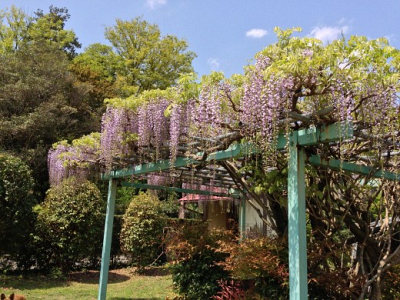 境内の藤が見頃となりました。かつてはもっと長く、また棚の面積ももっと大きかった。 気候のせいか…