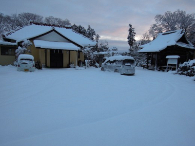 昨日の朝は、この写真のごとく一面の雪。 写真を撮った後、雪かきです。 ようやく人の歩く道は確保…