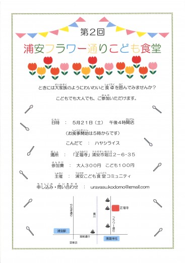 5月21日(土)午後4時開店 第2回浦安フラワー通りこども食堂が浦安こども食堂コミュ二ティ主催のもと…