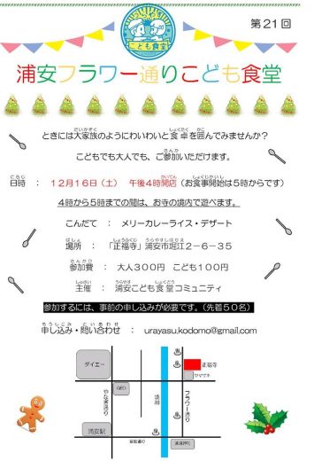 12月のこども食堂は16日です。 参加ご希望の方は urayasu.kodomo@gmail.com までお願いします。 …