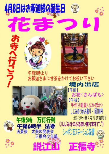 4月8日(月)花まつりご案内です 午前9時~本堂前にお釈迦様を安置しますので甘茶を掛けて…