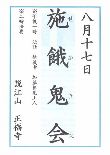 令和元年8月17日 施餓鬼会 午後1時 法話 德蔵寺 加藤彰晃上人 午後2時 法要 皆様のご参詣…
