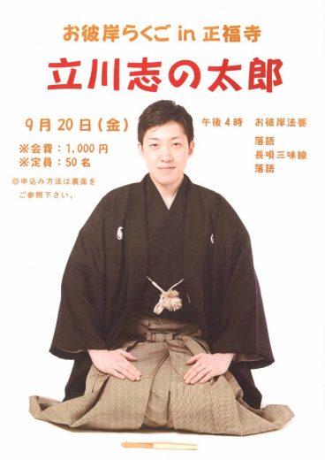 お彼岸らくごin正福寺「立川志の太郎」 日 時 9月20日(金)午後4時(3時半開場) 場 所 …