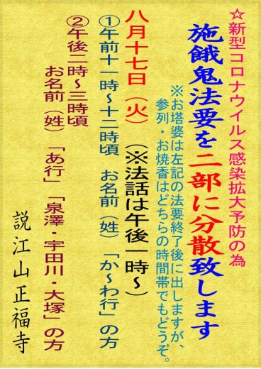 8月17日(火) 午前11時 第1部法要 午後1時 法話 午後2時 第2部法要