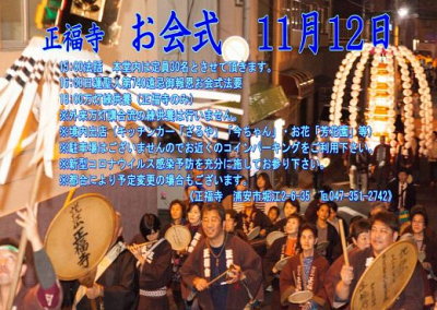 浦安正福寺お会式ご案内 11月12日(金) 15:00法話 16:00日蓮聖人第740遠忌御報恩お会式法要 ※本堂…