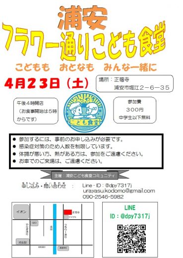 浦安フラワー通りこども食堂《4月23日》 イベント・活動 記事公開日:2022年04月20日 この記事は最終更新日から1年以上経過しています。記事の内容やリンク先については現在と状況が異なる場合がありますのでご注意ください。 開催日:2022年04月24日 当山は、浦安こども食堂コミュニティに協賛しています。 4月23日(土)午後4時開店・お食事は5時からです。 場所:正福寺 浦安市堀江2-6-35 参加費:300円(※中学生以下無料) ※参加するには事前のお申込みが必要です。 ※感染症対策の為人数制限をしています。 ※お車でのご来場はご遠慮下さい。 お申込み・お問合せ urayasu.kodomo@gmail.com 090-2546-5982 この記事は最終更新日から1年以上経過しています。記事の内容やリンク先については現在と状況が異なる場合がありますのでご注意ください。 PREV NEXT 一覧へ