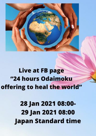 28日朝8時~29日朝8時まで世界中の僧侶や信徒さんが1時間づつお題目を唱えてコロナ終息、世界平和を祈ります。
