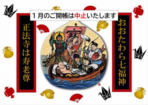 【中止のお知らせ】令和3年1月1~7日《おおたわら七福神》 イベント・活動 記事公開日:2020年12月25日 この記事は最終更新日から1年以上経過しています。記事の内容やリンク先については現在と状況が異なる場合がありますのでご注意ください。 現在、新型コロナウイルス感染症が拡大している状況を受け、 ご参拝の皆様の安心・安全を考慮し、 令和3年1月1~7日に予定しておりました おおたわら七福神の1月のご開帳を中止いたします。 ご参拝を楽しみにしていただいていた皆さまには このようなお知らせをすることとなり 当山といたしましても大変残念に思います。 一日も早く感染拡大の波が終息することを 心よりお祈り申し上げます。 この記事は最終更新日から1年以上経過しています。記事の内容やリンク先については現在と状況が異なる場合がありますのでご注意ください。 PREV NEXT 一覧へ