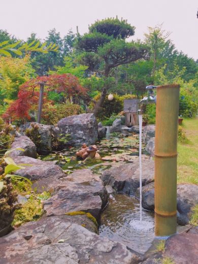 追:池の風情が少しでも増せば…と、水栓柱に孟宗竹を加工し被せてみました。蛇口も水跳ねが少なく使いやすい様に、泡沫栓へと交換致しました。
