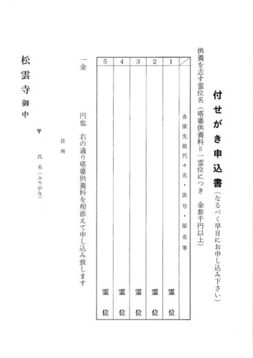 お施餓鬼申込書もお使いになれます。 コピーの上、メールまたはファックスにてお申し込みする事が…
