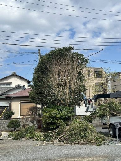 冬に業者様に桜を剪定していただきましたが、今回その延長線で大きくなった常緑樹『モクセイ』と『…