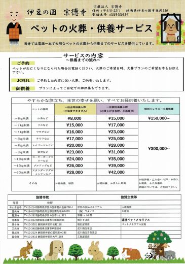 伊豆 長岡のお寺でペット火葬開始しました。霊光寺でも葬儀供養します ブログ 記事公開日:2023年03月02日 この記事は最終更新日から1年以上経過しています。記事の内容やリンク先については現在と状況が異なる場合がありますのでご注意ください。 ペットを飼って居る家庭が多いのに火葬・葬儀・供養をするお寺が少なくて、よくお願いをされます。長岡の宗徳寺でペット火葬を用意しました。住職も連携協定結び、檀家や近隣の方の応対をいたします。 今後(数年内に)ペット墓を用意し、愛犬愛猫とうの供養できる環境を整えていきます。 この記事は最終更新日から1年以上経過しています。記事の内容やリンク先については現在と状況が異なる場合がありますのでご注意ください。 PREV NEXT 一覧へ