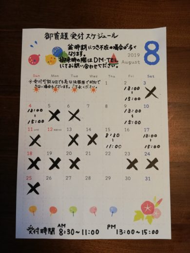 8月はお盆月のため、対応できる日が限られますのでご確認下さい。 なお、御不明な点がありましたらお…