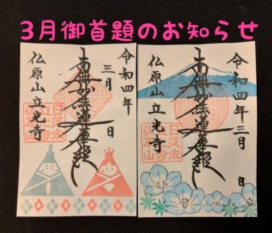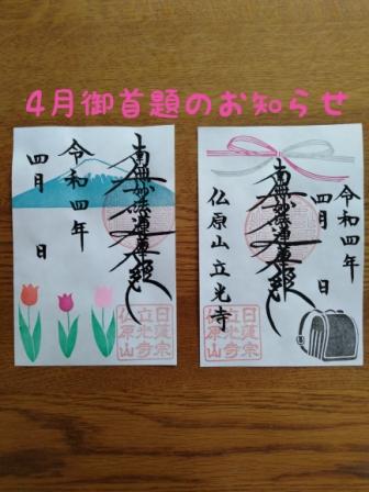 【今月の御首題のお知らせ】 ご覧いただきありがとうございます? 来月からは新しい年度が始まります…