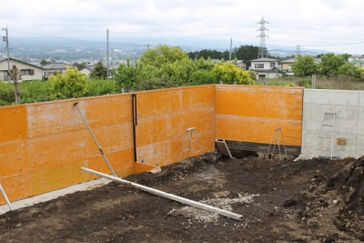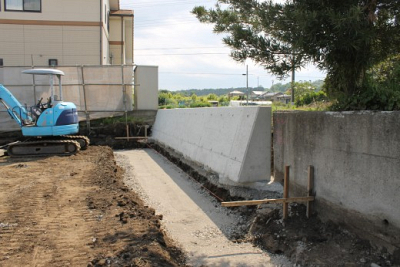 開発行為に則ると北東部分ではこのような擁壁の工事が行われる 結構高い 右に出来たコンクリート壁…