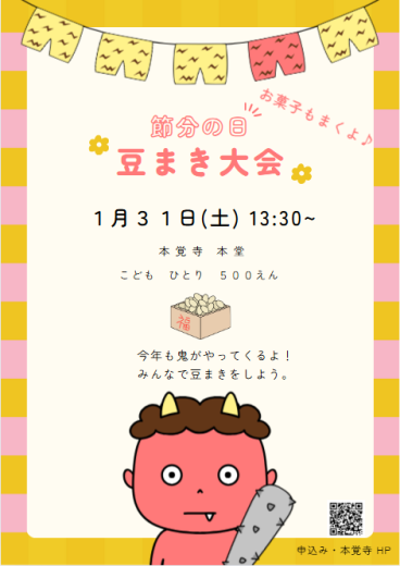 ◎日にち 1月31日(土) ◎流れ(予定) 13:30~ 受付・節分のお話 14:0…