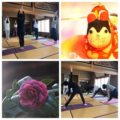 令和2年1月8日(水)寺ヨガを開催いたしました。 麗らかな新年の光を浴びて、紅色の椿が境内に色を添…