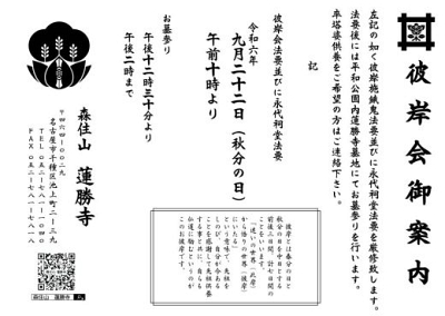 令和6年9月22日(日蓮・秋分の日)当山蓮勝寺に於いて午前10時より「彼岸施餓鬼法要並びに永…