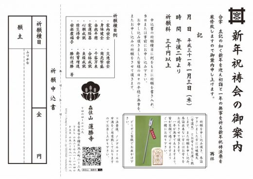 平成31年1月「新年祝祷会」のご案内 イベント・活動 記事公開日:2018年12月20日 この記事は最終更新日から1年以上経過しています。記事の内容やリンク先については現在と状況が異なる場合がありますのでご注意ください。 開催日:2019年01月03日 新年を迎え下記の如く初詣と一年の無事を笙の音色と共に祈る「新年祝祷会」を執り行います。 詳細は画像をご覧頂き祈願希望の方は住所・氏名・祈願種目を明記のうえFAX、Eメール、または当日受付にてお申し込み下さい。 記 月日 平成31年1月3日(木) 時間 午後2時より この記事は最終更新日から1年以上経過しています。記事の内容やリンク先については現在と状況が異なる場合がありますのでご注意ください。 PREV NEXT 一覧へ