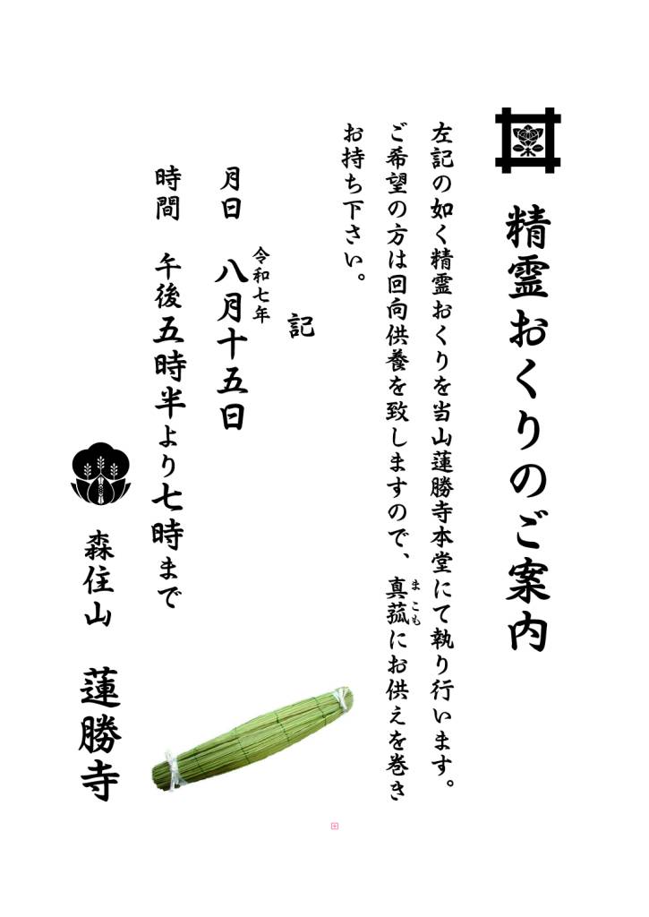 令和7年8月盆「精霊おくり」のご案内 イベント・活動 記事公開日:2025年08月11日 開催日:2025年08月15日 下記の如く当山本堂にて令和7年8月盆の「精霊おくり」回向を行います。 本堂にお上がり頂き、お名前をお申し出下さい。 順番にお名前をお呼び致しますのでお焼香下さい。 記 月日 令和7年8月15日(金) 時間 午後5時30分から7時まで PREV NEXT 一覧へ