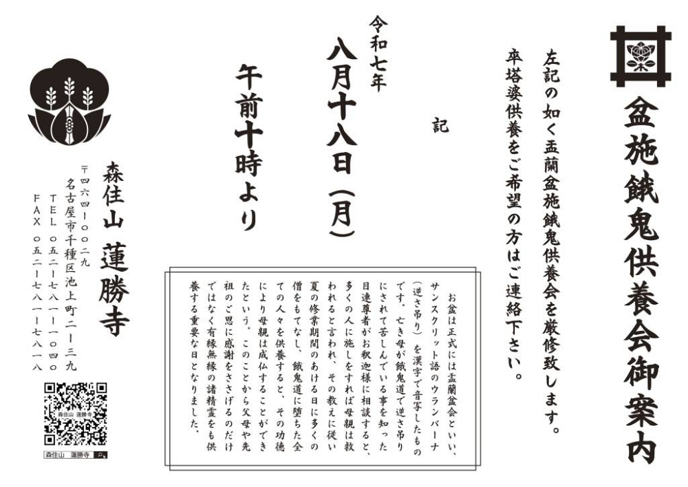 令和7年8月「盂蘭盆施餓鬼供養法要会」のご案内 イベント・活動 記事公開日:2025年08月12日 開催日:2025年08月18日 令和7年8月18日(月)当山蓮勝寺に於いて午前10時より「盂蘭盆施餓鬼供養法要会」を厳修致します。 卒塔婆供養、回向供養の申し込み希望の方はお問い合わせ下さい。 PREV NEXT 一覧へ