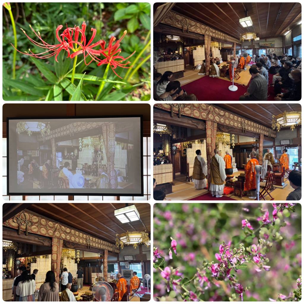 当日は、「暑さ寒さも彼岸まで」という言葉どおり、厳しい暑さも和らぎ、穏やかな秋日和に恵まれました。境内では彼岸花が赤く咲き揃い、萩の花が風にそよぐ姿も美しく、まさにお彼岸にふさわしい景色が広がっておりました。