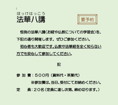 法華八講(法華経の学習会)を開催しました。今回は、妙法蓮華経化城喩第七について学習しました。…