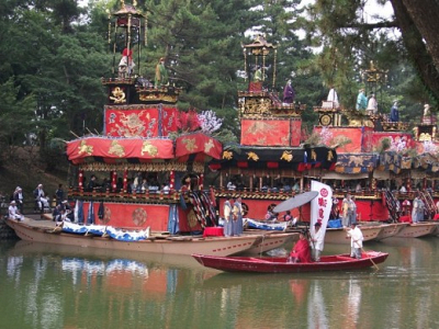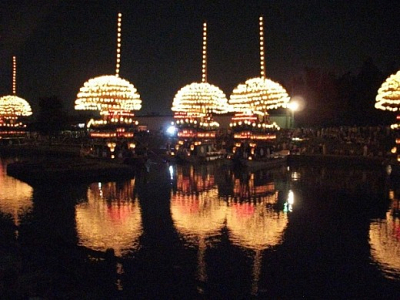 宵祭の翌日には、朝祭が行われます。 前夜の巻きわら舟とは装いを新たにした山車船が、華麗な姿を…