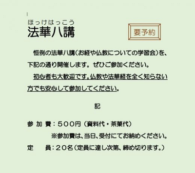 法華八講のご案内です。 どなたでもご参加いただけますが、事前の予約が必要です。 詳細は、以下…