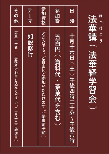 10月16日(土)の午後4時30分より、法華講(法華経学習会)を開催いたします。今回のテーマは「如説修行」…