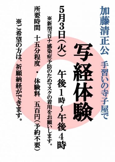 5月3日(火)の午後1時~午後4時に写経体験を開催します。 体験所要時間は15分程度です。…