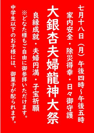 恒例の大銀杏夫婦龍神大祭を7月18日(月)午後4時より厳修いたします。 どなた様もご自由にご参…