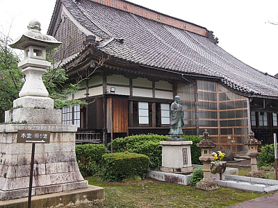 この銅像は、両津 源助屋、土屋辰治、雪絵だ夫婦の御意思に依り、当山参詣者の皆様に老若男女を問わず、少しでも合掌の気持ちを持って参詣なさって頂きたいという願いを込め、昭和57年に宗祖七百遠忌に建立された銅像です。