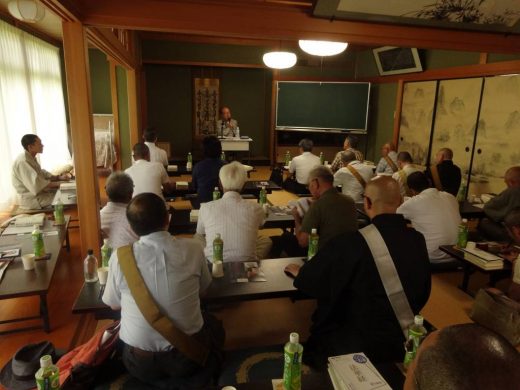植木雅俊先生の本に出会って6年。ついに先生を自坊にお招きし、直接先生から教えを受ける日が来た。石川・富山県の全日蓮宗御寺院、金沢の法華宗御寺院に案内状を送り、教箋を通じて檀信徒にも参加を呼びかけた結果、僧俗あわせて32名の熱心な方々に集まっていただいた。あいにく台風12号が接近しており、直撃される恐れもあったが、幸いコースが変えてくれた。「新幹線が止まれば、先生のお話が聞けない。」全員の思いが台風にコースを変えさせたのかも知れない。(西日本の被災地の方々には誠に申し訳ないが)