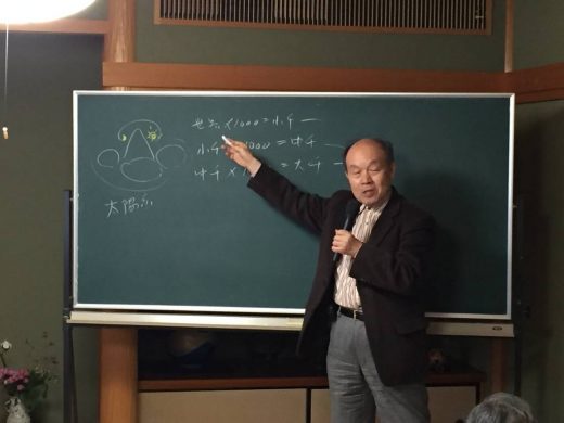 今回は化城喩品第7から法師品第10のさわりまでを、予定時間を遙かに超えて、4時45分まで熱心に講義していただいた。お話の内容はすべて新鮮で、あっという間に時間が過ぎた。三千塵点劫と五百塵点劫の桁外れの時間を、物理学者でもあられる先生だけに数学的に説明されて、参加者全員感心することしきり。