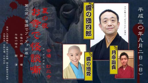 今年の「落語でブッダin卯辰」は上方怪談噺を十八番とする露の団四郎師匠(NHK朝ドラ「わろてんか」出演)をゲストにお招きし、「夏の夜 お寺で怪談噺」のタイトルで行います。真っ暗な本堂で聴く怖〜い怪談噺。心臓が停止しても、おしっこ漏らしても責任は負いません。