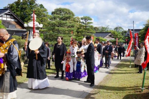 お題目の旗を先頭に、午前8時から約40名のお稚児さんや僧侶、そして子供が大好きな「こぞうくん」も参加し、本堂まで練り行列を行いました。長女は、化粧をして稚児の衣装を着れたのがとても嬉しかったそうですが、一番下の次男は衣装を着るのも嫌がり、記念写真のときは、金の烏帽子(えぼし)を頭から無理やりはずしていました。