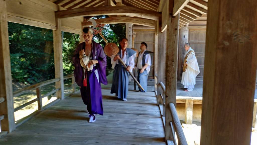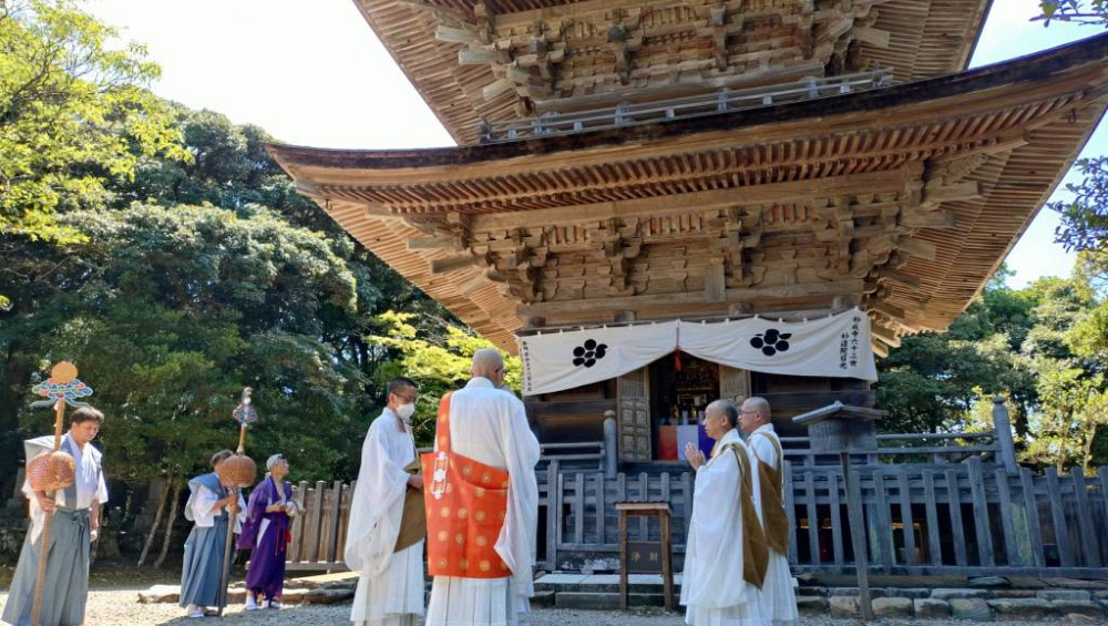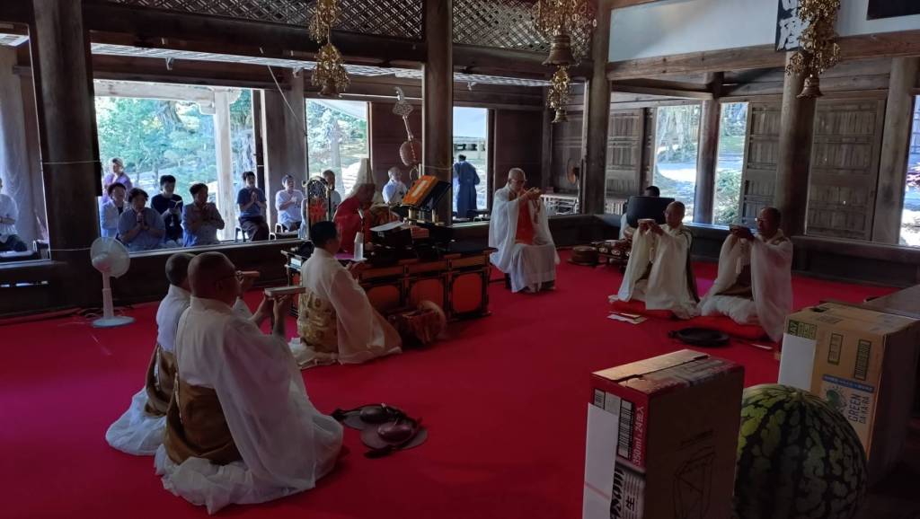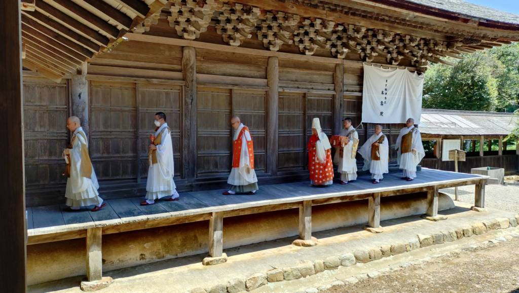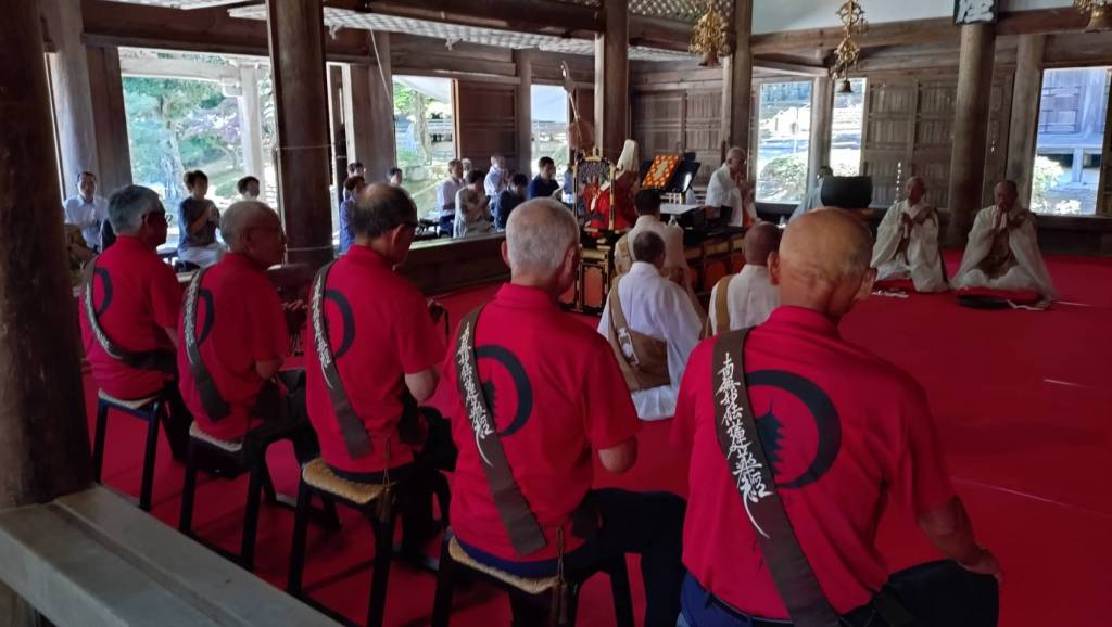 それでも暑い中、古式に則り山伏姿の長浜章さんや、裃を着た長谷川武治さん・若狭雄介さんに先導され、続いて藤井貫首猊下と式衆が行列して本堂に進みます。本堂では厳かに法要が行われました。総代さん5名は妙成寺国宝化の赤いお揃いのシャツを着て参拝されました。本堂の後、五重塔前でもお経を読みます。終わった時は汗だくです。皆さま暑い中お疲れ様でした。