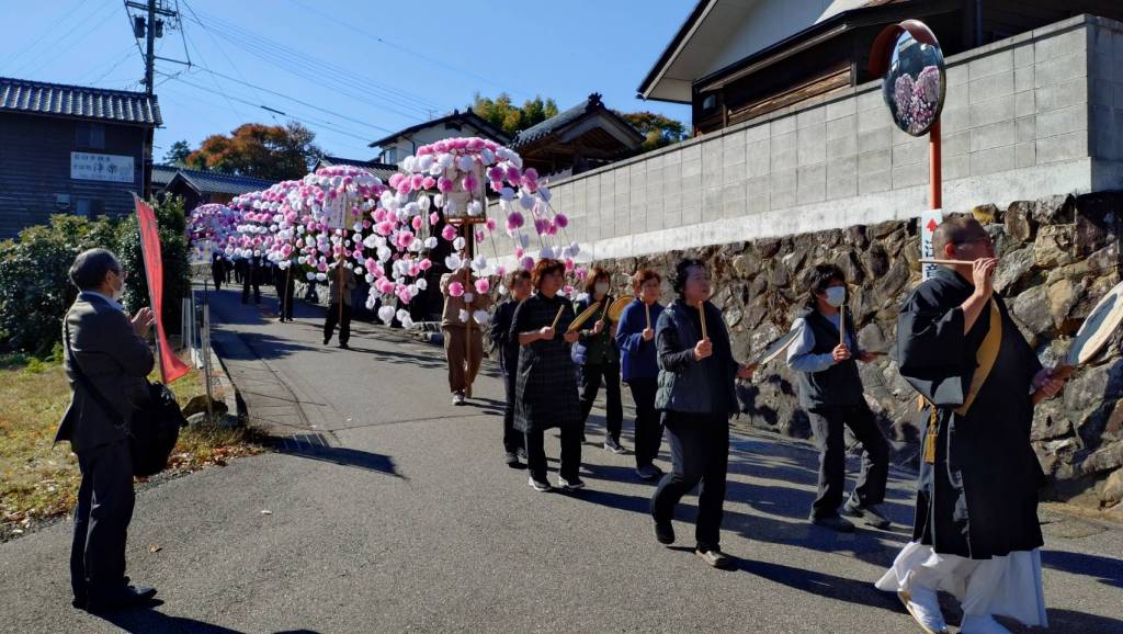 12日、玉寿寺にて宗祖報恩お会式の法要を奉行しました。まず10時半に本山妙成寺のお会式桜を飾った万灯行列が玉寿寺前から出発します。当山の参詣者も合掌で万灯行列を見送ります。雲一つない秋晴れのなか団扇太鼓を先頭に万灯行列が本山へ進みます。五重塔の上には澄んだ青空の中に白い月も見えていました。(写真)
