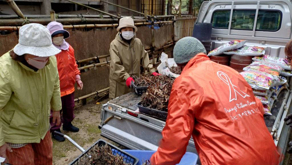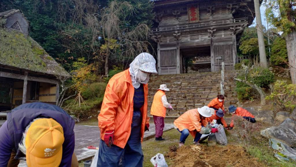 🔶晴天に恵まれた12月2日、本山妙成寺にて羽咋市の市民団体フラワーメイトの皆様による「シャクヤク」の花の株を境内に植えるご奉納がありました。フラワーメイトの皆様は、羽咋市の公共施設にも花壇の整備などに取り組まれ、本年石川県知事からも功労者の表彰を受賞されています。このたび妙成寺の国宝化推進の為にも花で支援をしたいと有り難いお申し出があり、奉仕でシャクヤク30株が池の周りに植えられました。代表の浅野由美子さんはじめ8名のメンバーが手にスコップを持ち作業されました。来年5月下旬に花を咲かせる予定です。その際は多くの方にシャクヤクの花を見に妙成寺に来て頂きたいと思います。フラワーメイトの皆様、ありがとうございました。
