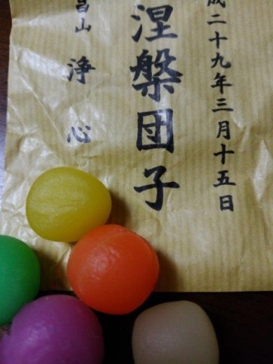 3月15日、『釈尊涅槃図』をご宝前に掲げ、色とりどりの『涅槃団子』をお供えし、お釈迦さまのご遺徳…