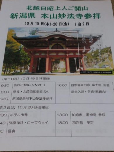 本年の団参は、10月19・20日に新潟県長岡市村田の本山妙法寺と柏崎市の番神堂を参拝します。 …