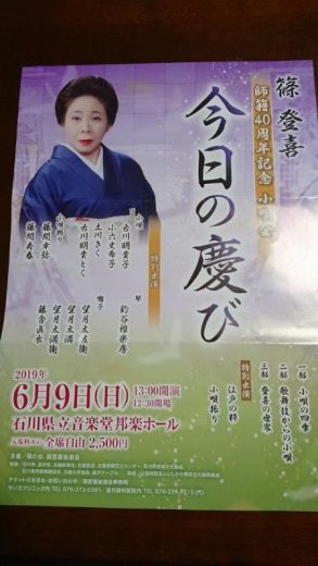 9日、金沢駅近くにある、石川県立音楽堂邦楽ホールにて、篠登喜先生の師籍40周年を記念する小唄会…