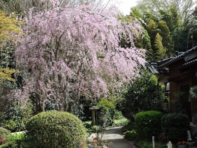 妙圀寺境内にある枝垂れ桜が満開です。年々大きくなっており、濃いピンク色のつぼみから白色の花びら…