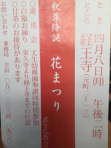 4/8 武生佛教会主催の「花まつり」が 当山会場にて開催されます。 参拝は自由 甘茶の接待がありま…