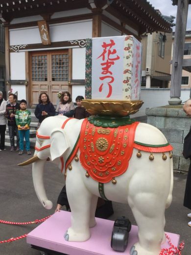 4月8日 お釈迦様の御降誕を祝う「花まつり」を奉修しました。 園児と一緒に白象の像を曳き、誕生仏に…